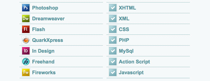 可以通過特殊的設(shè)計網(wǎng)站布局,列出我們可以帶來的服務(wù)內(nèi)容,而非只是通過文字的形式展示,這樣網(wǎng)站訪問者可以更容易看到這些信息,例如“熟練使用:Photoshop,PHP,HTML”等。