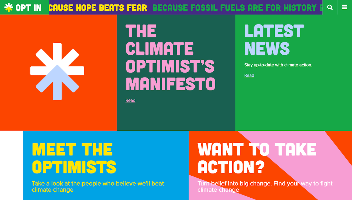 氣候樂觀主義者是一個試圖解決氣候變化的項目。鮮艷的色彩和基于卡片的布局帶來視覺吸引力,并讓您滾動以獲取更多信息。