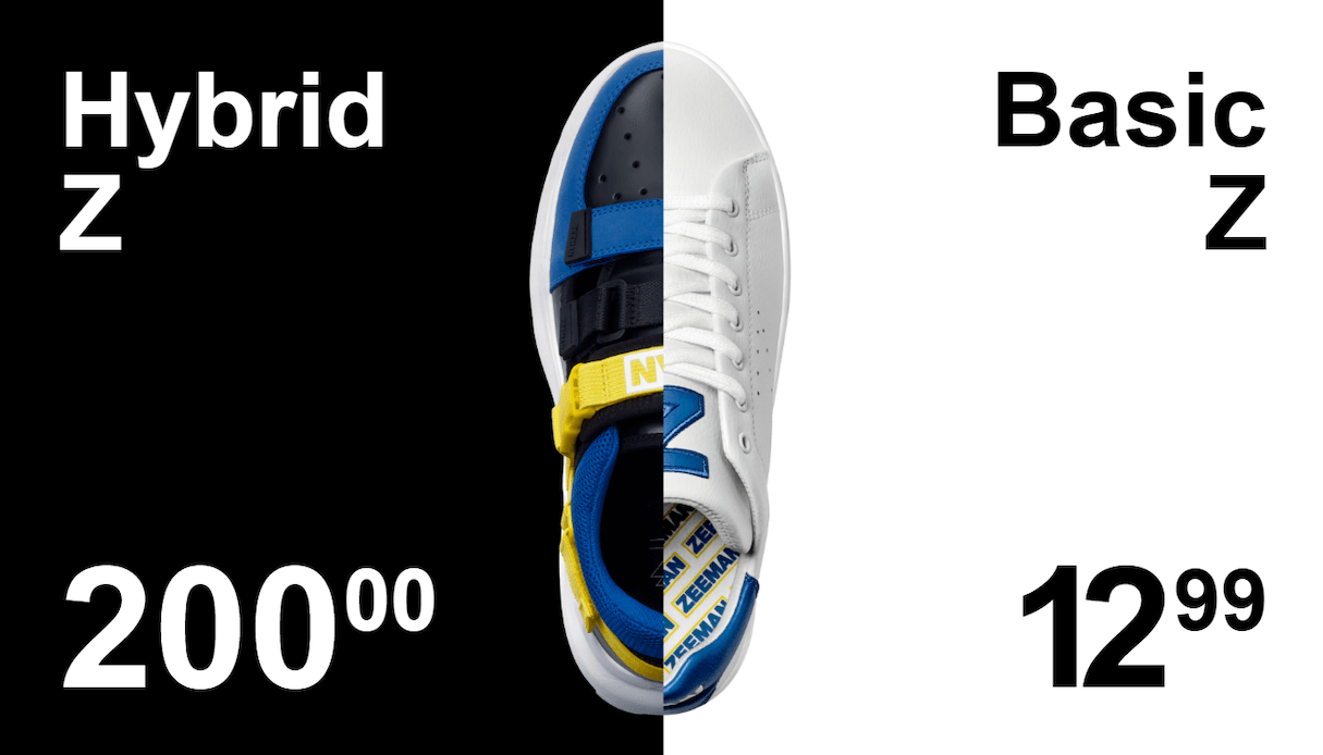 Zeemansneaker使用分屏呈現兩種不同的產品。