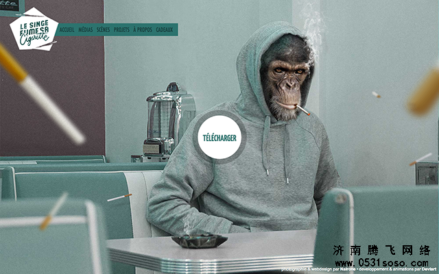 10、他?她?還有它!幽默的擬人化動物形象能為網頁加入更多的詼諧色彩。如下案例所示,大猩猩不例外的成了整個頁面的主角,為了要將用戶的視線引到內容或是導航上,設計師在這些內容上添加了純色塊,讓網頁主次分明。
